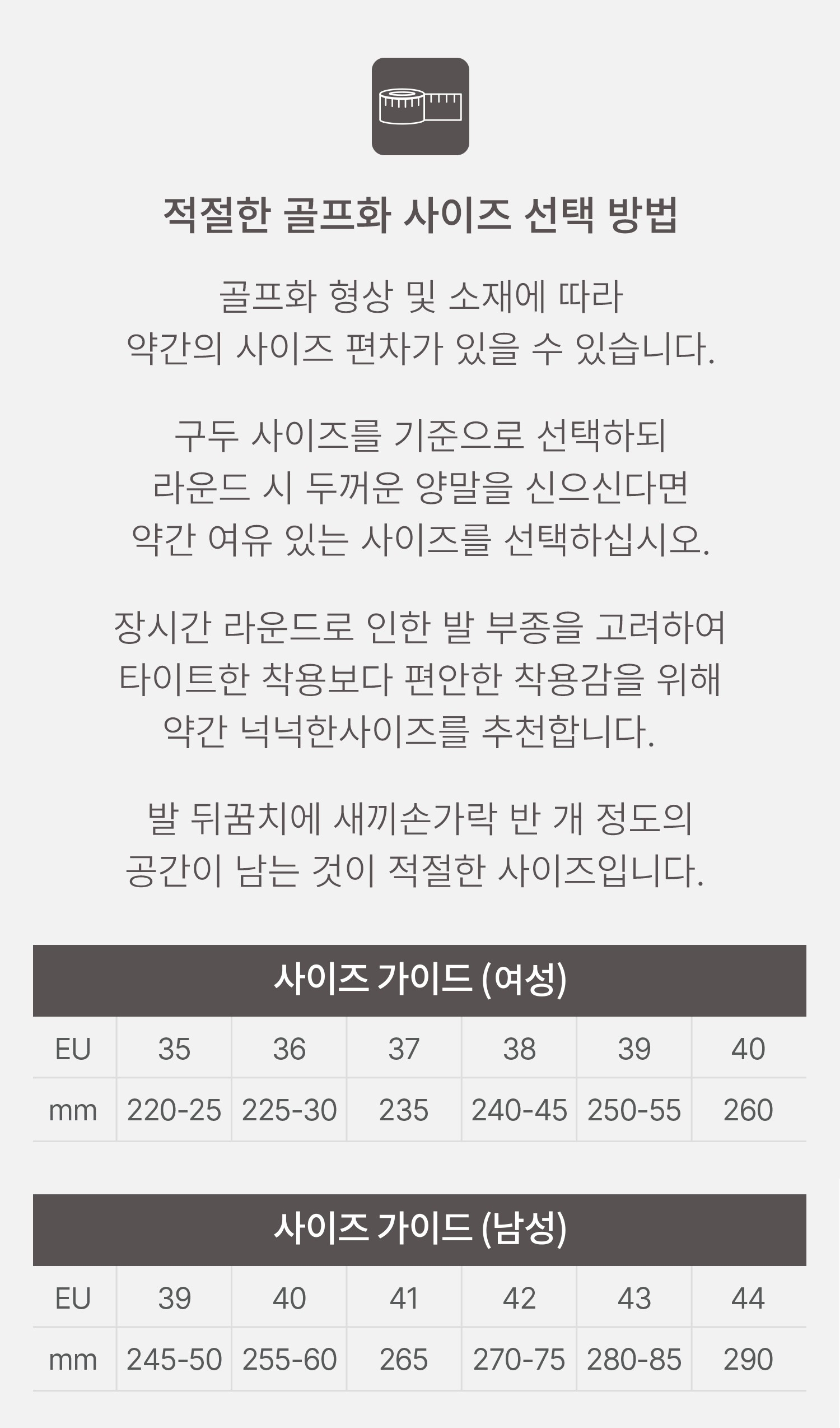 스타일 측면에서는 드레스 구두의 실루엣을 기반으로 설계되어 남성 골퍼의 바지 끝단과 특히 조화롭고 클래식한 멋을 연출합니다. 여성 모델은 발목이 가늘고 길어 보이도록 디자인되어 스커트·바지 모두에서 슬림한 클래식 룩을 완성합니다.